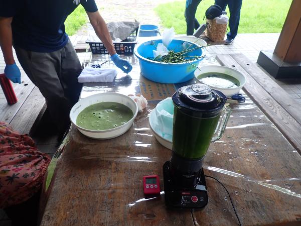 県民の森で育てタデアイを使って生葉染めを体験していただきました。