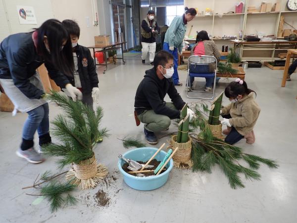 | 内容 | 竹、松の葉、梅の枝を使い、ミニサイズ(W18×D18×H60)の門松を作ります。※午前・午後各1回開催、各回20名 |