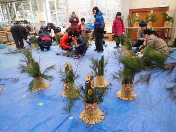 | 内容 | 竹、松の葉、梅の枝を使い、ミニサイズ(巾40Cm×高さ80Cm程度) の門松を作ります。 |