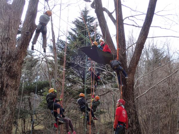 ツリークライミング専用のロープや安全保護具を使って木に登り自然との一体感を味わっていただきました。