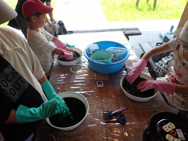 県民の森で育てたタデアイを使って生葉染め体験して頂きました。